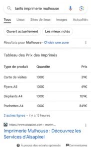 Les études de cas démontrent l’efficacité de nos stratégies SEO. Par exemple, nous avons récemment travaillé sur l’optimisation SEO pour notre page « imprimerie Mulhouse« . Notre objectif était de nous classer en première place pour le mot-clé « prix flyers Mulhouse« . Grâce à une stratégie SEO bien pensée et une mise en œuvre rigoureuse, nous avons réussi à atteindre la première position sur Google en seulement 13 heures. Voici les captures de notre étude de cas;